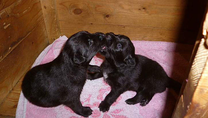 Anfangs gab es keine großen Unterschiede zur ersten Woche : die beiden Welpies schliefen und tranken Milch bei Mama. Diese wiederum bestand nun darauf, ganz normal mit den anderen beiden Hunden mit raus zu gehen.