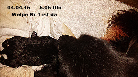 Um kurz nach 2 Uhr fingen dann die Presswehen an........und die dauerten an ! Erst nach drei Stunden ( und ich völlig fertig, Presswehen sollten nämlich nicht (!) so lange dauern.......und drei Stunden sind lang ) kam dann mit einem schönen Schwupps ein Welpilein zur Welt : eine schwarze Hündin (am nächsten Tag sah man, dass sie black and tan ist). 260 Gramm Geburtsgewicht. Fit. Saugt sofort. Puhh ! Gut so !