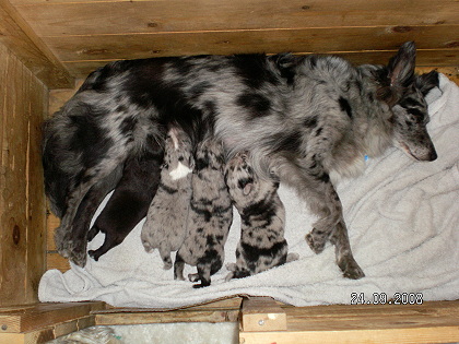 Meine erste Alpie-Hündin Trixi mit ihren Welpen (meinem ersten Wurf).
