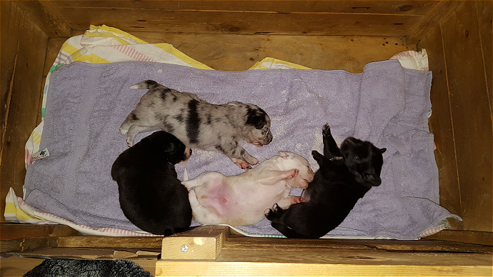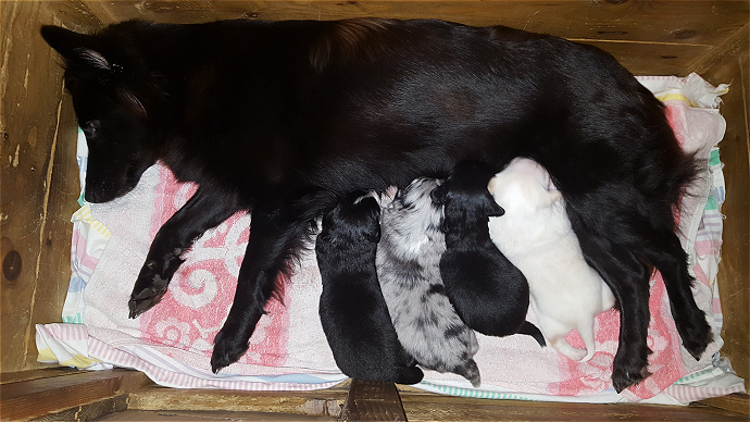 Vor Ort wurde jeder Welpe sorgfältig untersucht, abgehört und Temperatur gemessen. Alle hatten normale Temperatur, alle aber gespannte Bäuche und Nr 2 (Eisbär)und Nr 3 (Bluemerle) Darmgegluckse.